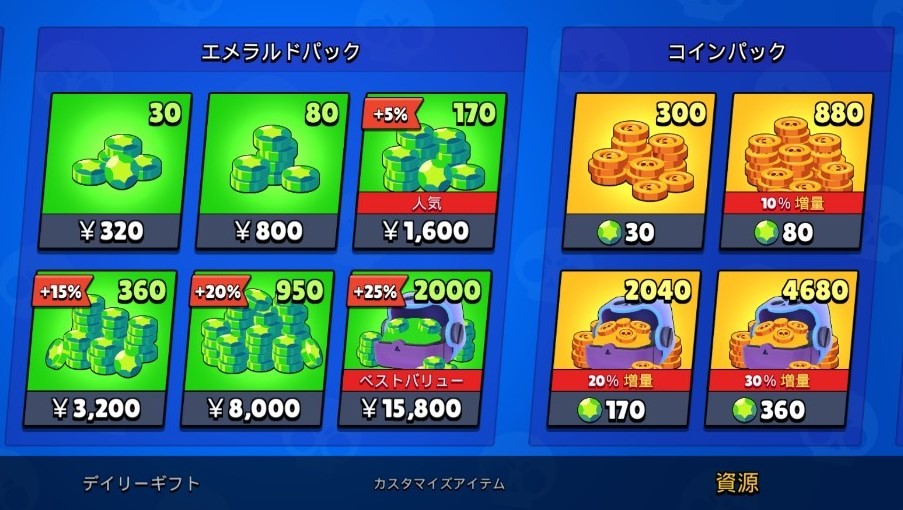 ゲーム内通過のエメラルドを購入することで課金をしていきます。スキンやキャラクターを購入することでキャラクターの育成や強化に使うことができます。