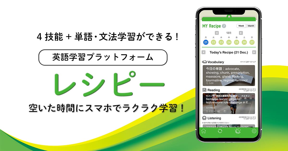 『レシピー 英語が趣味になるアプリ』(旧POLYGLOTS)は、リーディング、リスニング、スピーキング、単語学習までをスマホ一つで完結できる、オールインワン型の英語学習アプリです。