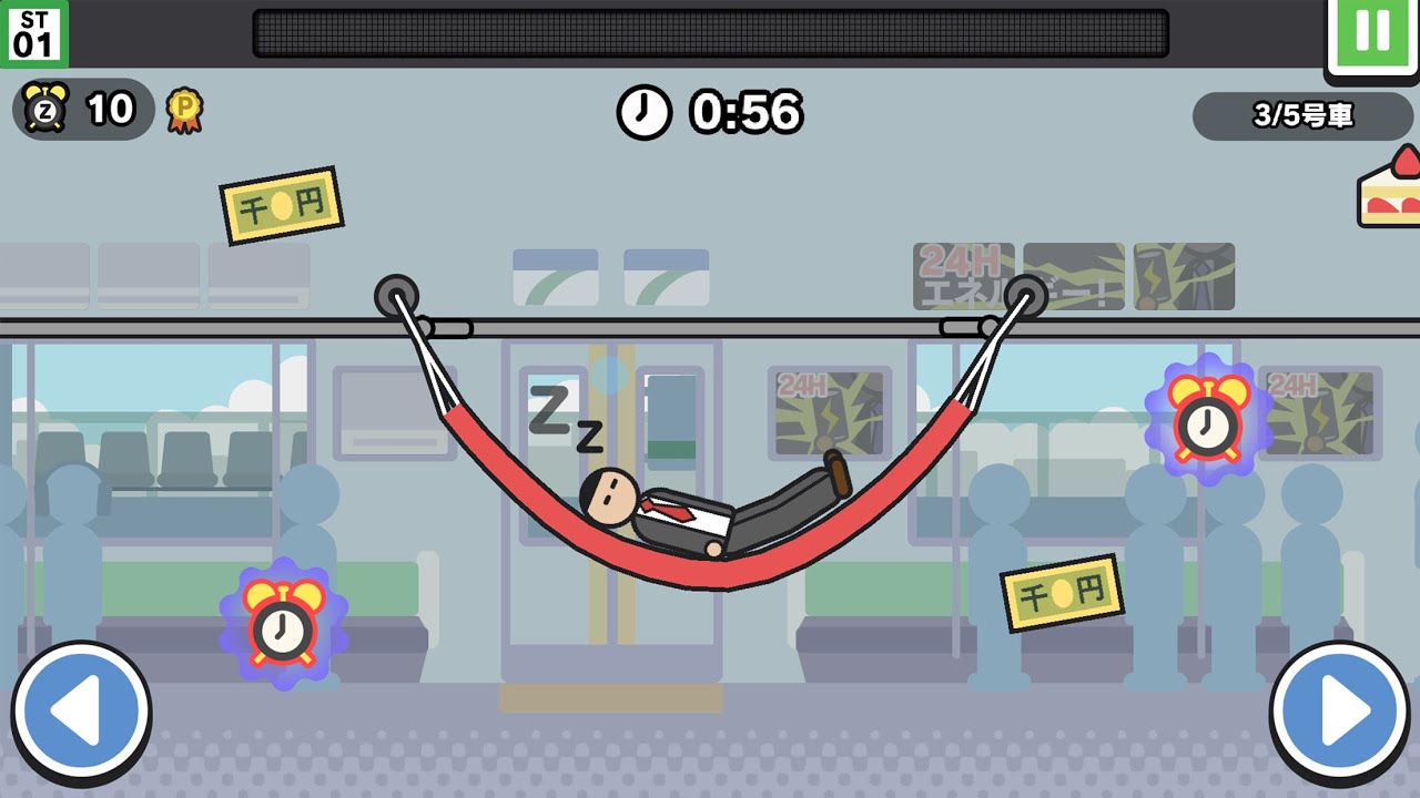 『今日は行けません。』は、『にゃんこ大戦争』で有名なポノス(PONOS)が贈る、「満員電車の中でハンモックに乗って二度寝する」という狂気のコンセプトを形にした痛快カジュアルゲームです。