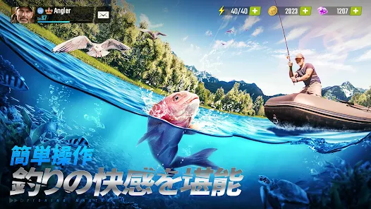 - スマホが釣り竿になる臨場感:端末を振ってキャスティングをしたり、リールのテンションをコントロールしたりと、実際の釣りのような直感的な操作が楽しめます。魚がヒットした時の振動やクイックタイムイベントの緊張感はたまらない。